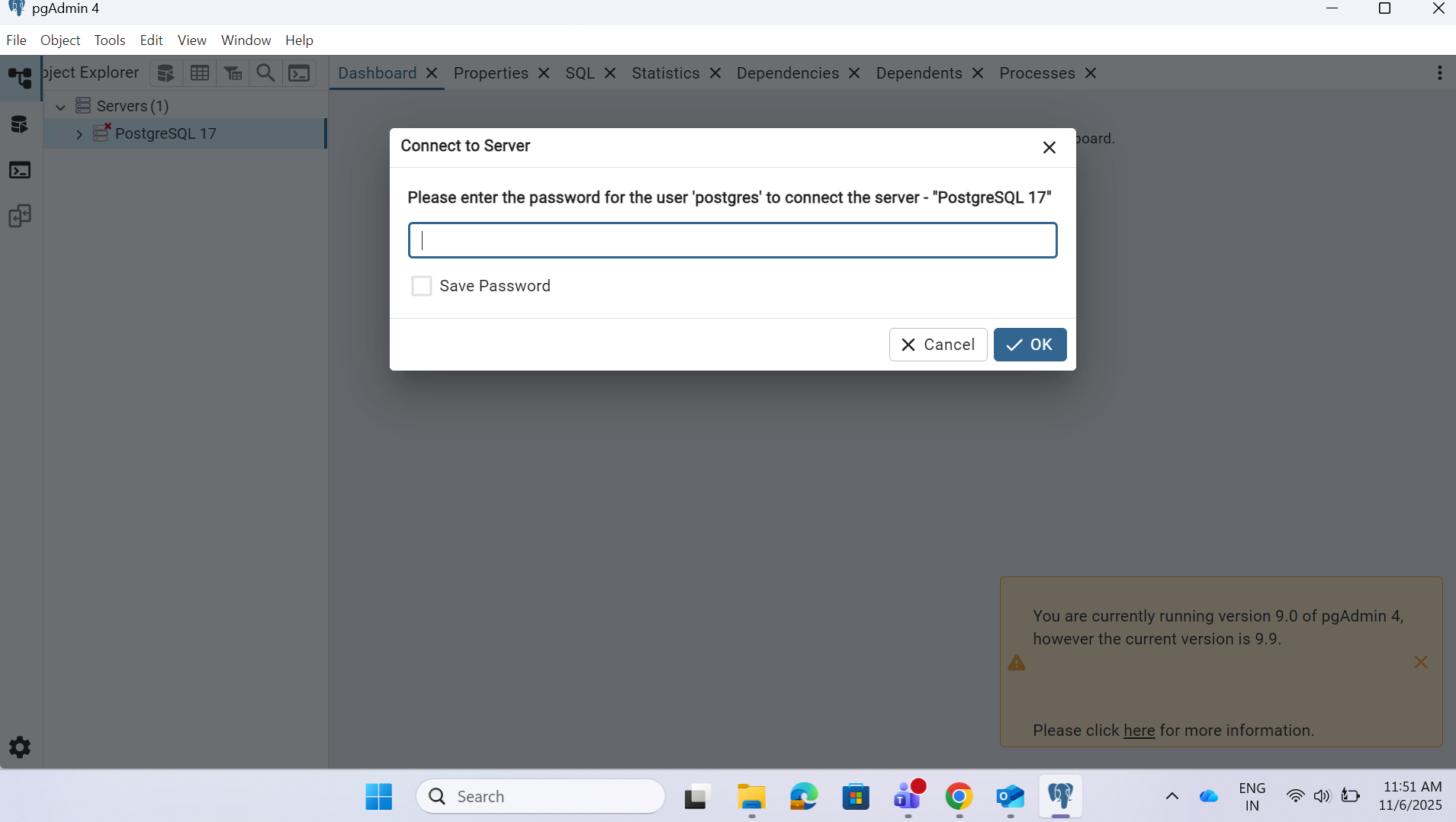 PostgreSQL got installed on its own automatically by the system but I did not get any notification to create a password to Connect to Server as shown below. Could you please assist me to set up the password, please let me know in case of more details required.