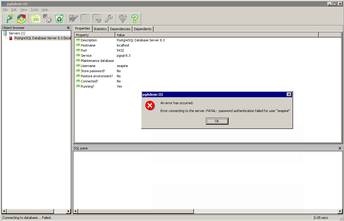 2. For SurroundSCM, I read the Moving Surround SCM and PostgreSQL Servers Between Computers article and I tried the pgAdmin III but could not log into the local PostgreSQL server with the supplied password of s34p1n3, see screenshot below. Is there a different password? I am running pgAdmin III version 1.8.2.