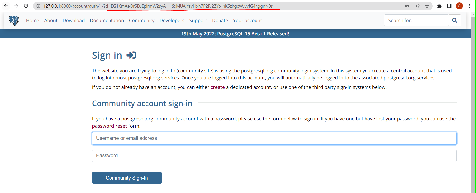 As a part of GSoC 2022, I am working on the project pgarchives. I have cloned both pgarchives & pgweb and installed all the dependencies. But I am facing a problem in connecting pgarchives to pgweb. If I open the pgarchives in the browser, it first redirects me to login screen of pgweb. Then after giving credentials and submitting the form, it remains on the same screen. Just the URL is changing. Also I am getting 404 on accessing mailing lists from the mailing lists option present in the quick links section of pgweb.