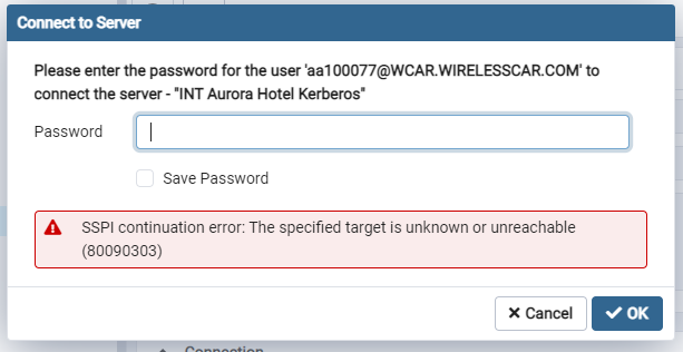 psql: error: connection to server at "mbcs-int-aurora-postgres-hotel1.cluster-cqmavtizubqt.eu-west-1.rds.amazonaws.com" (10.183.41.9), port 5432 failed: SSPI continuation error: The specified target is unknown or unreachable